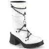 2 3/4 tum (70 mm) tjock klack, 1 tum (25 mm) plattformsstövel på mitten av vaden, med pyramidring, skruvbultar, o-ring för hängande skalle och metallkedjedetaljer på vampen, metalldragkedja baktill