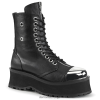 krossa scenen och gör ett uttalande med gravedigger-250, den ultimata rockstjärna-kängan som säkerligen kommer att väcka uppmärksamhet. dessa häftiga kängor i mitten av vaden har en slående förkromad metalltåhätta, spännband och en stor silverbensplatta och klopiggar. snörningsdesignen och vegansk läderfinish ger en edgy känsla, medan metalldragkedjan på insidan gör det lätt att bära. kombinera dessa stövlar med din favoritläderjacka, jeans eller leggings och var redo att rocka varje event med självförtroende.